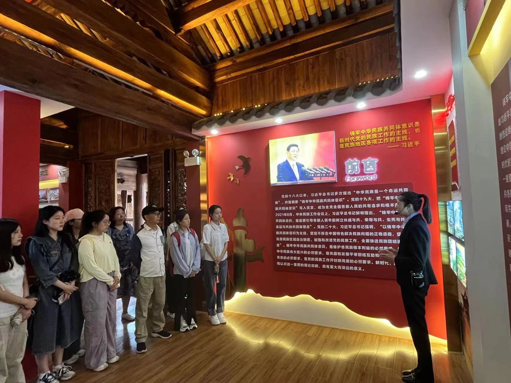 隨后,在講解員生動具體的講解下師生黨員參觀了革命紀念館。在一樓展廳我們仿佛又回到了革命先輩們生活的時代,那一個個革命的身影又展現在了我們的眼前,紀念館的每一個革命故事,都訴說著過去的輝煌與犧牲,激勵我們不忘初心,砥礪前行。踏著古樸的木板樓梯,我們來到二樓鑄牢中華民族共同體意識主題館,徜徉館中,隨處都能看到“中華民族一家親,同心共圓中國夢”的和諧畫卷,“像石榴籽一樣緊緊抱在一起”,成為巍山各民族共居、共學、共事、共樂面貌的生動描述,寄托著各民族密切交往、相互依存、休戚與共的良好愿望。