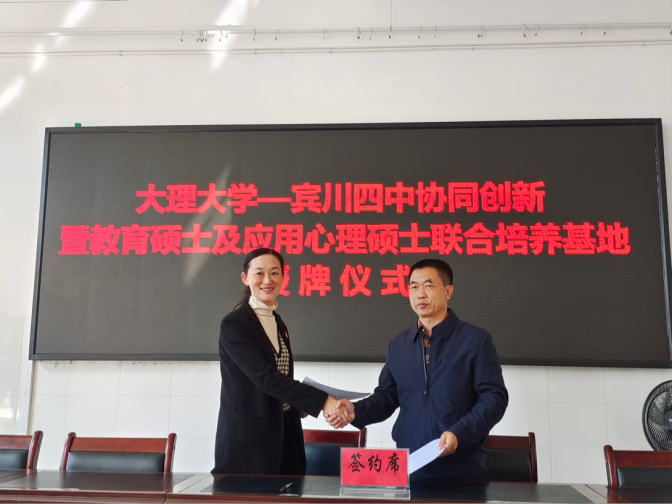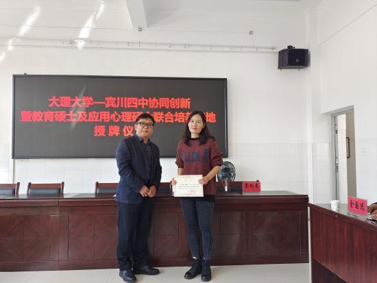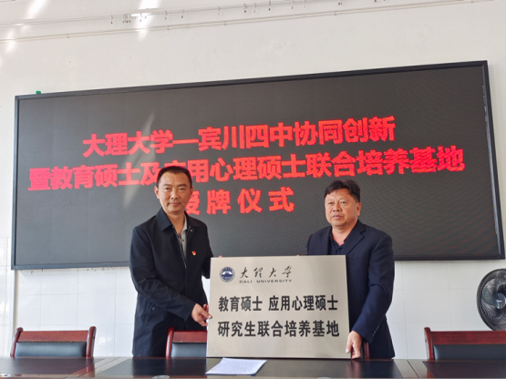 10月28日,大理大學教師教育學院與賓川縣第四中學協同創新暨教育碩士及應用心理碩士聯合培養基地授牌儀式在賓川縣第四中學會議室順利舉行。教師教育學院院長孫亞娟、黨委書記楊民、副院長張九洲、研究生辦主任鄧云輝及骨干教師,賓川縣第四中學校長李樹彬、黨委副書記李順新、金國遠副校長、楊建副校長代表出席了儀式。儀式由賓川縣第四中學由楊建主持。