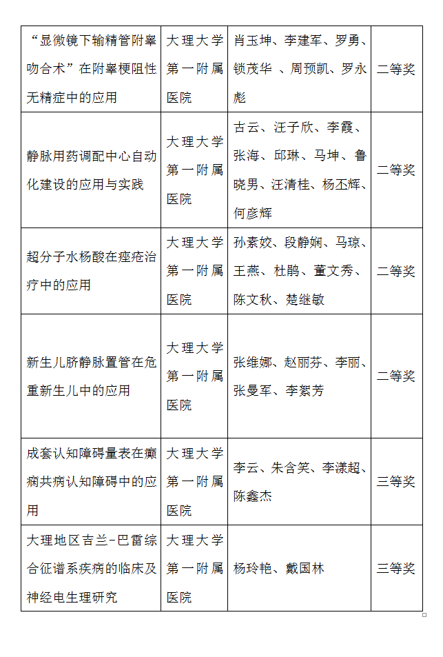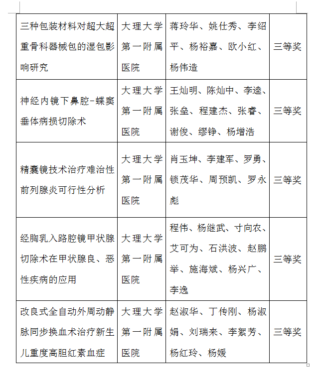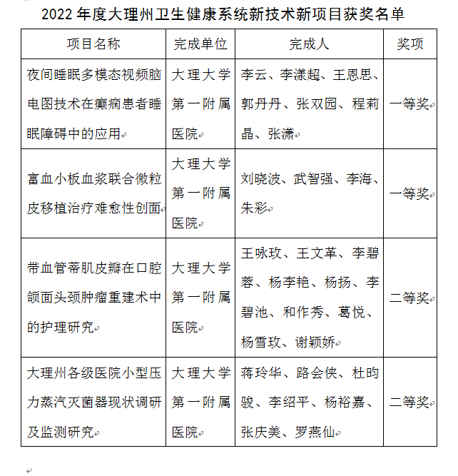 近日,在2022年度大理州各級衛生健康機構新技術項目評審中,經過前期單位推薦、分類初審、專家評審等程序,大理大學第一附屬醫院共有15個項目被授予“大理州衛生健康新技術新項目獎”。其中一等獎2項,二等獎6項,三等獎7項。本次獲獎的項目,均已在我院實施,并著力向周邊及基層醫療衛生機構推廣,所取得的經驗也均總結為論文并發表。