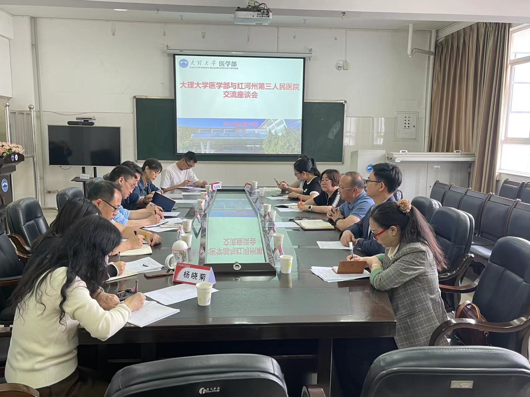 4月20日,紅河州第三人民醫(yī)院副院長后群及本單位相關(guān)領(lǐng)導(dǎo)人員一行6人到醫(yī)學(xué)部進行交流,學(xué)校學(xué)生處、教務(wù)處、醫(yī)學(xué)部相關(guān)領(lǐng)導(dǎo)及職能部門負責人參加了此次座談會。