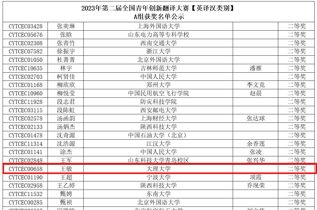 近日,我校外國語學院教師王敏在2023年第二屆全國青年創新翻譯大賽(A組:研究生及同等學歷)中榮獲英譯漢類別二等獎。