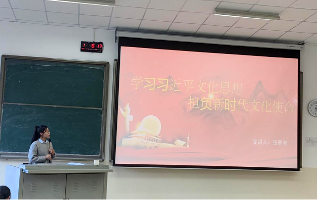 張景寶、李艷、戴雨菲、段玲玲等四位同學結合自己親身經歷與感受,圍繞習近平文化思想“九個堅持”、“十四個強調”、“新的文化使命”、“七個著力”和“宣傳思想文化工作的首要政治任務”等主要內容展開了宣講。