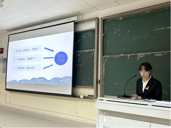 陳貴杭同學圍繞習近平文化思想中“兩個結合”的相關內容向大家講解了馬克思主義基本原理為什么可以與中華優秀傳統文化相結合,還通過集體宣誓的互動方式呼吁青年學子加入文化傳承的隊伍。