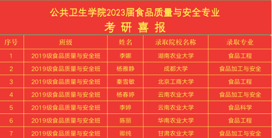 公共衛生學院歷來重視學風建設,始終將研究生考試作為加強學風建設的重要抓手,不斷提高人才培養質量。我院2023屆共有食品質量與安全專業畢業生40人,報名參加2023年碩士研究生20人,報考率50%,截至5月12日擬錄取7人,升學率達17.5%,較2022屆提高近8倍,取得了歷史性的突破。