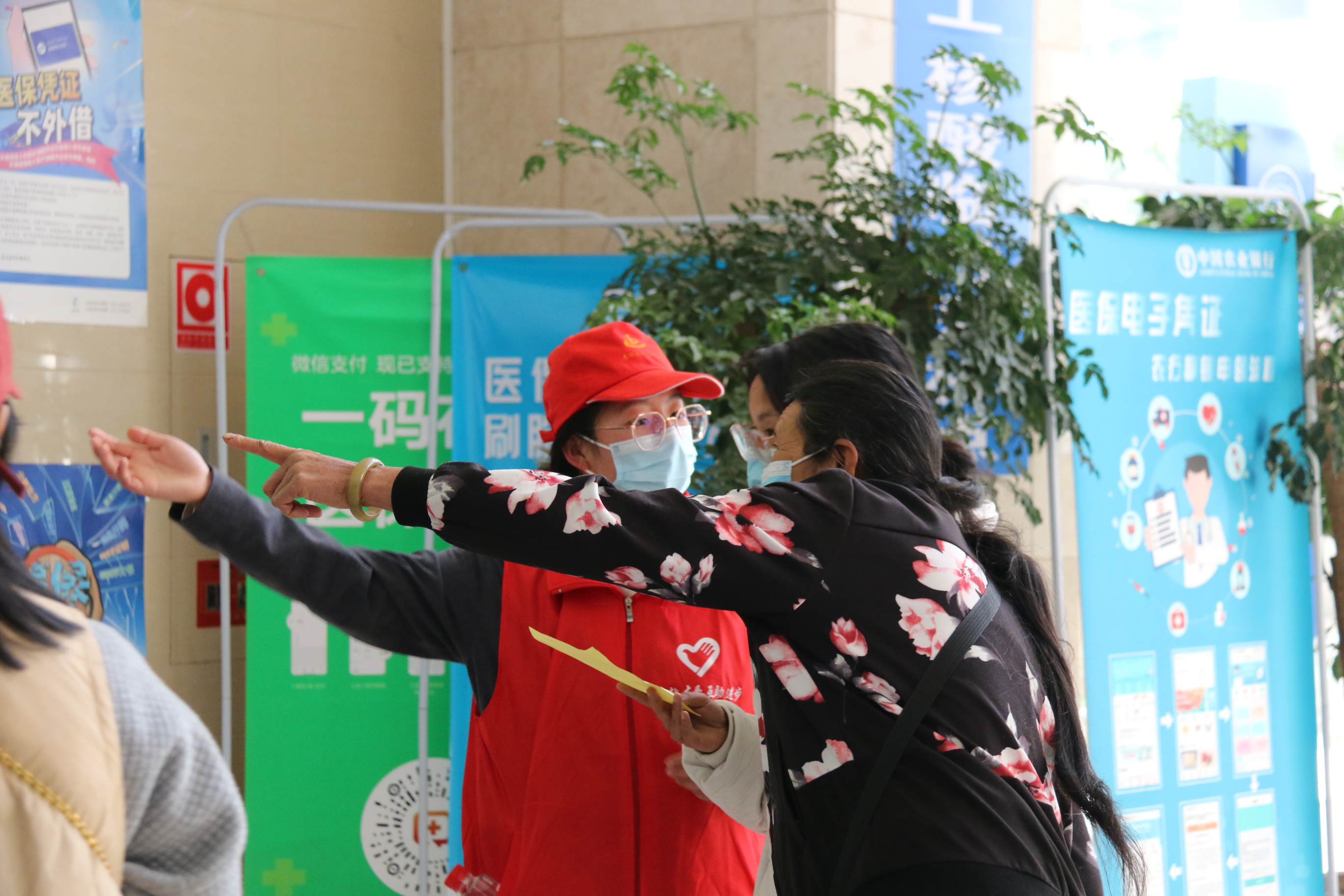 在進行集中培訓后,志愿者們身著紅馬甲,分組在醫院門診大廳、醫技樓、2號住院樓大廳為患者和家屬提供導醫導診、文明勸導、咨詢答疑、協助自助機使用、維護就診秩序等志愿服務。“請問這項檢查要去哪里做?”“手機掛號繳費怎么弄?”“請幫我看一下,這張單子要交到哪?”……面對各種各樣的提問和求助,志愿者們始終熱情耐心地解答,切實幫助患者和家屬解決問題。
