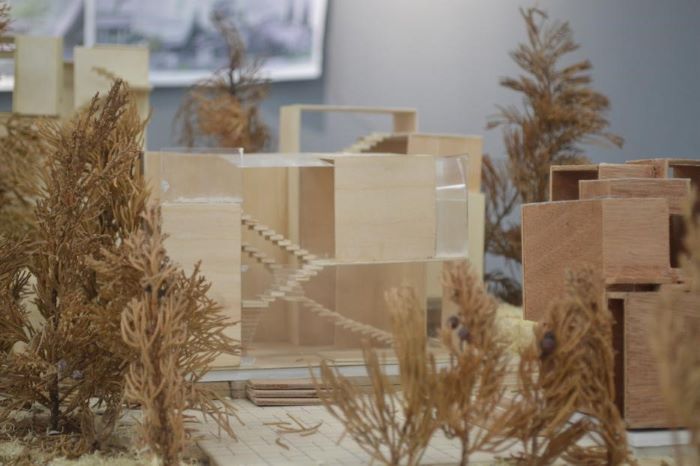 根據指導老師胡丹介紹,完成此次展覽的作品,學生們用了一個學期的時間。在學習兩門專業課的基礎上,從確定主題到繪制草圖,然后是平面圖、草模,最后才是整體模型的搭建。要從二維平面的圖紙,到三位立體的模型,這是一個漫長而艱難的過程,極其考驗學生的空間建構和轉換能力。需要學生們將全部的精力傾注其中,還有不斷的試錯、不斷的修改,最終才有了呈現在此次展覽上堪稱精美的作品。
