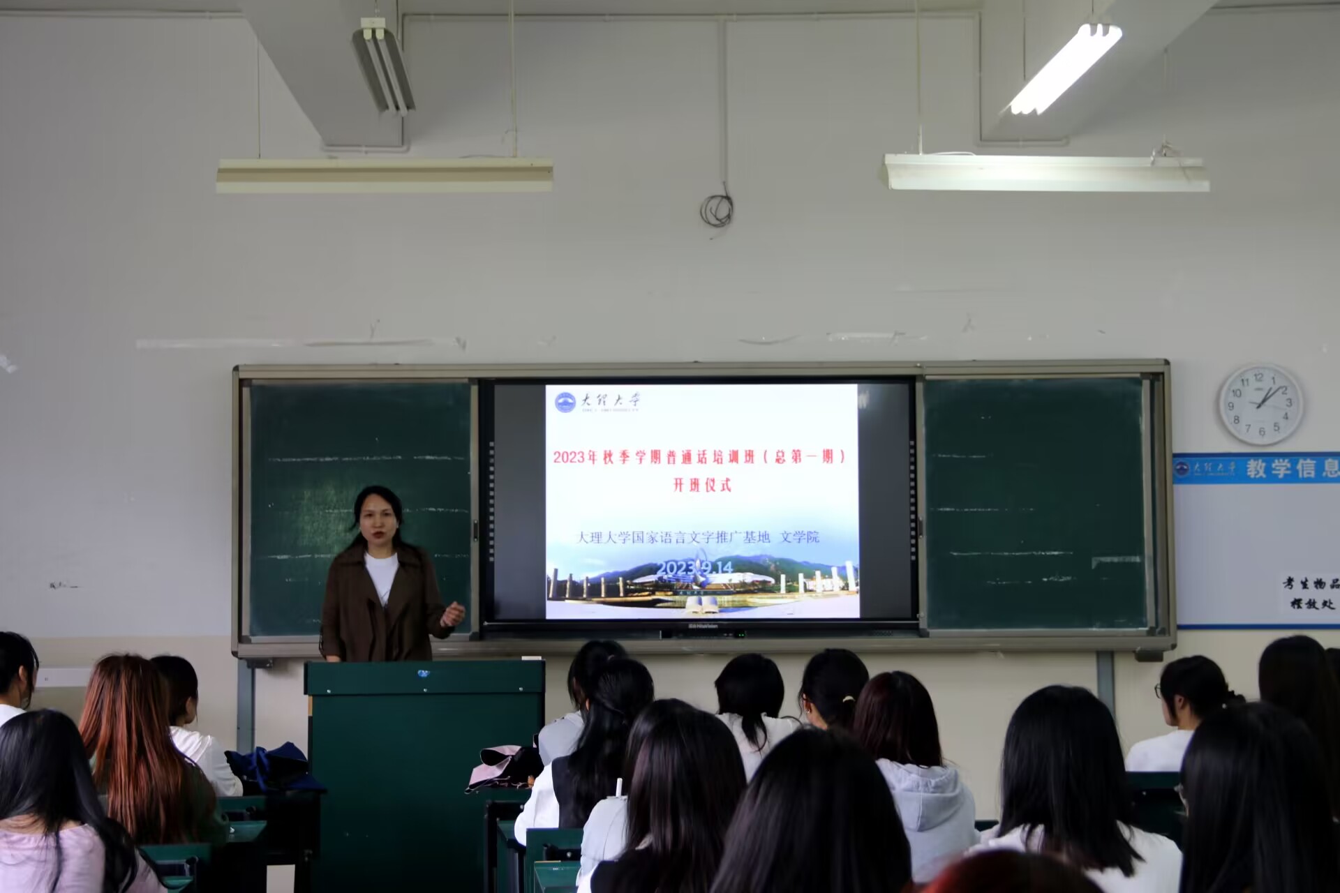 9月14日,由大理大學國家語言文字推廣基地和文學院共同舉辦的文學院2023年秋季學期普通話培訓班(總第一期)順利開班。文學院副院長、大理大學國家語言文字推廣基地負責人張錫梅及本期50名學員參加開班儀式。