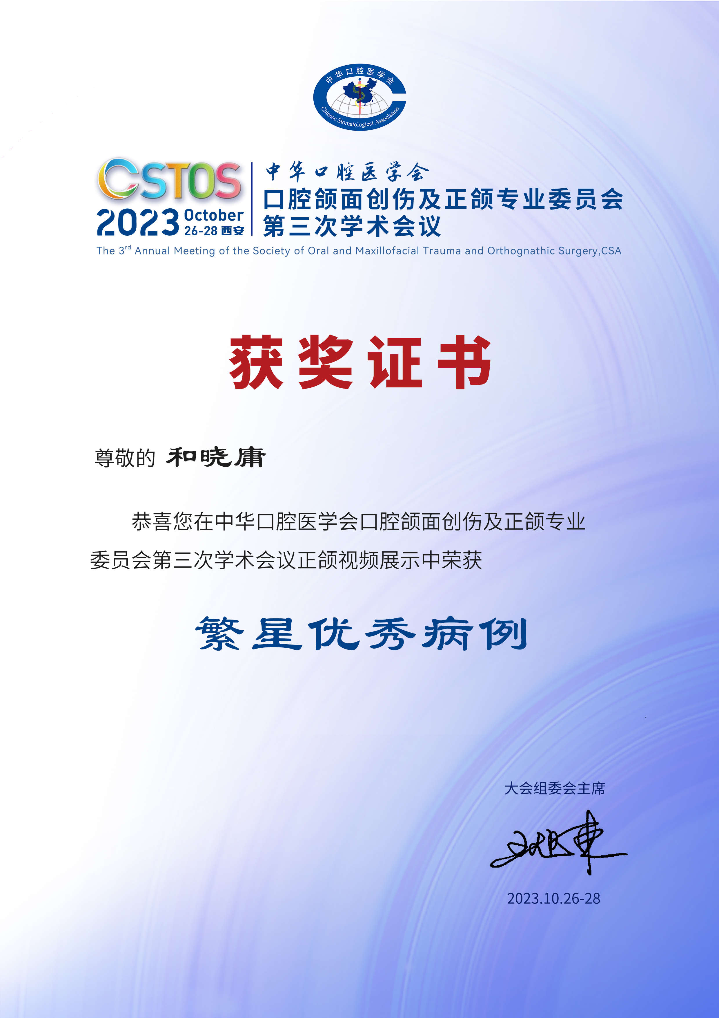 近日,2023年中華口腔醫(yī)學(xué)會(huì)口腔頜面創(chuàng)傷及正頜專業(yè)委員會(huì)在西安舉辦全國(guó)正頜手術(shù)視頻病例大賽。大理大學(xué)第一附屬醫(yī)院口腔頜面外科和曉庸醫(yī)生的參賽病例《骨性III類錯(cuò)頜(偏突頜)畸形Lefortl+BSSRO》作為云南唯一入選病例,在此次大賽中喜獲“繁星優(yōu)秀病例”。