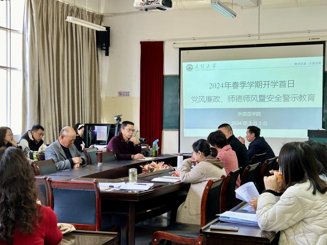 3月1日,外國語學(xué)院召開2024年春季學(xué)期開學(xué)教職工大會(huì),開展黨風(fēng)廉政、師德師風(fēng)暨安全警示教育。學(xué)院黨政領(lǐng)導(dǎo)、全體教職工參加會(huì)議。