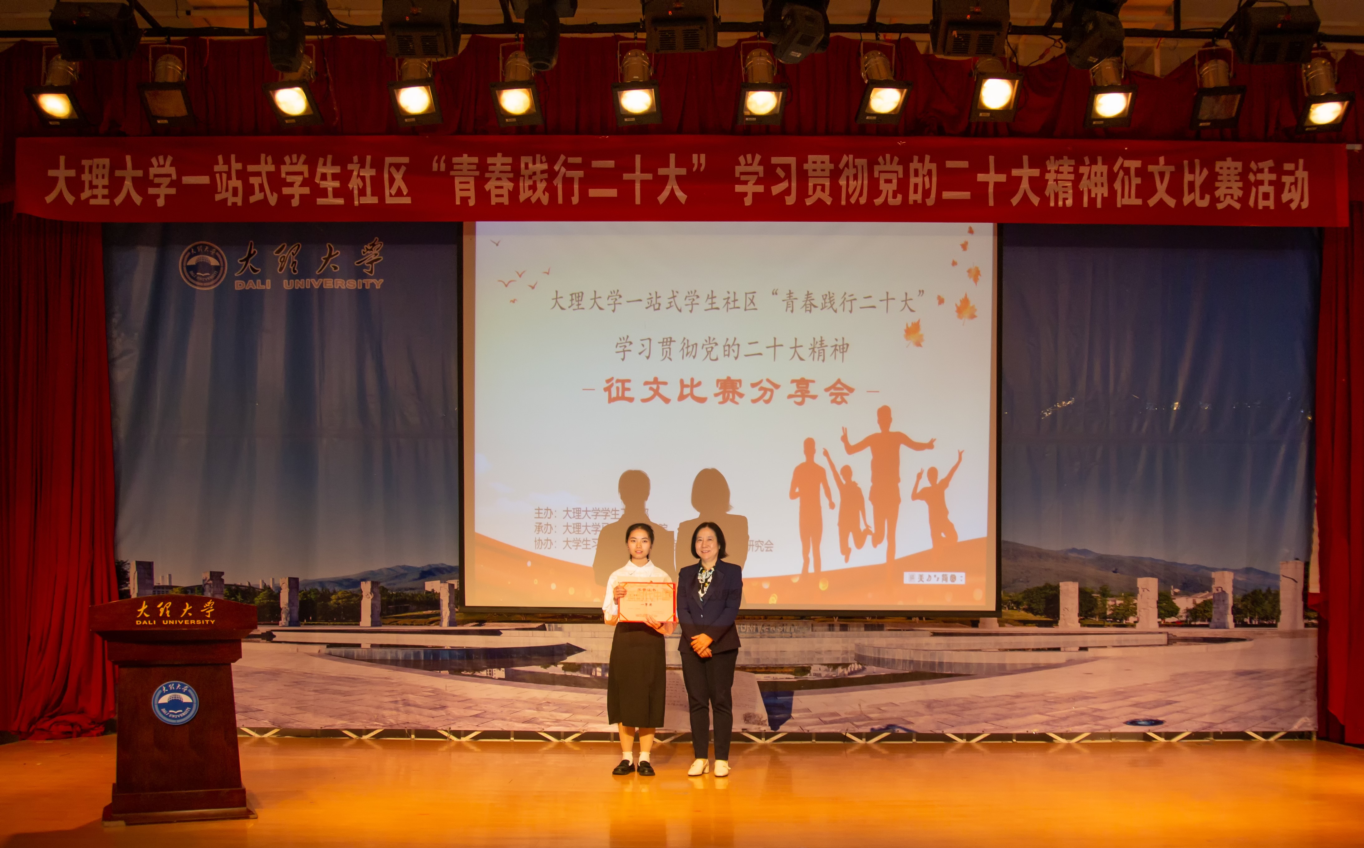 5月26日,大理大學“一站式”學生社區“青春踐行二十大”征文比賽分享會在古城校區舉辦,學校黨委副書記李彥萍,副校長穆智,黨委委員、宣傳部部長劉翃,學生工作處副處長張立敏參加本次分享會。