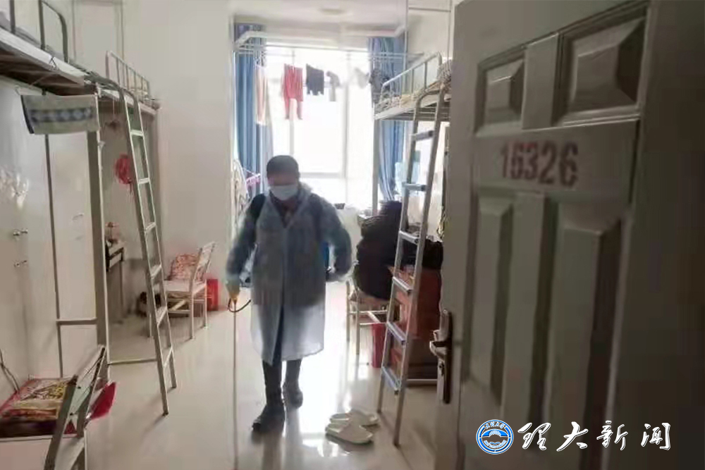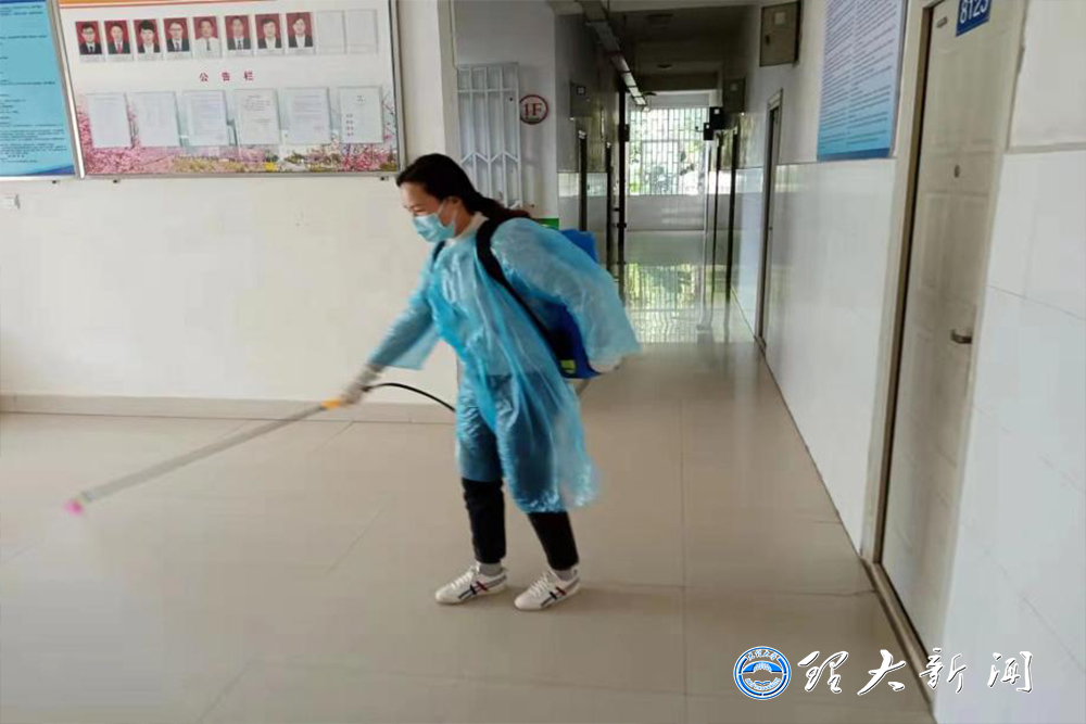 公寓管理員閻江麗說:“身為理大的一名宿管員,噴霧器是我們的槍,消毒液是我們的子彈,病毒就是我們的敵人,每天按時對公寓的宿舍和公共區域進行全方位消殺;樓道和宿舍開窗通風,用酒精對隨時接觸的物品噴殺,不留任何死角讓病毒有機可乘;消殺之外也不忘照顧好學生宿舍里的花花草草。日常工作中嚴格的做到管好人、看好門、把好關,仔細檢查返校學生的‘兩碼一酸’,嚴格防控外來人員進入。全校師生眾志成城,為確保每一個學生和職工的安全而努力著。我相信,在全校師生的共同努力下,我們一定能打贏這場疫情防控戰。”