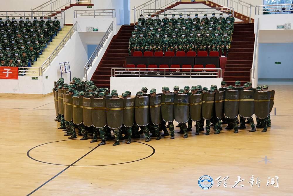 大會在全場齊聲高唱中華人民共和國國歌中拉開序幕。在熟悉又昂揚的檢閱進行曲中,女子國旗護衛隊、退役復學的大學生教官方隊和2021級本科生組成的共8個受閱方隊,昂首闊步,氣勢磅礴,以響亮的口號,抖擻的精神依次通過主席臺,接受檢閱。軍體拳、刺殺操、隊列操表演、防爆隊形演練,班組戰術綜合演練項目依次漂亮完成,穩健有序的步伐、整齊劃一的隊列,詮釋著2021級本科生拼搏昂揚的斗志;颯爽的英姿、嘹亮的口號,彰顯著2021級青年學子的蓬勃朝氣和奮勇向前的精神風貌。