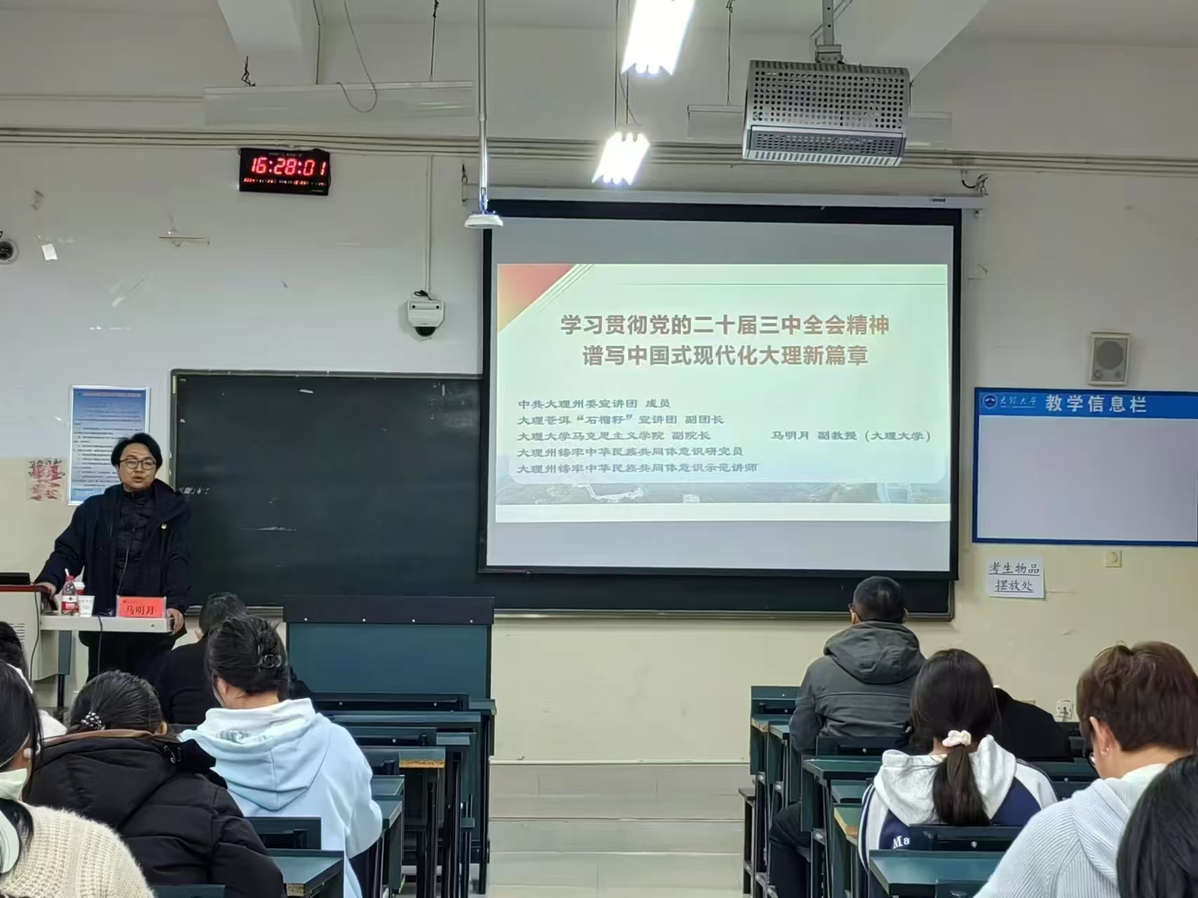 馬明月副教授以《學(xué)習(xí)貫徹黨的二十屆三中全會(huì)精神,譜寫中國式現(xiàn)代化大理新篇章》為題,詳細(xì)解讀了全會(huì)的主要內(nèi)容和精神實(shí)質(zhì)。通過深入淺出的講解,幫助同學(xué)們深刻理解進(jìn)一步全面深化改革的指導(dǎo)思想、總體目標(biāo)以及重大原則等重要內(nèi)容。運(yùn)用生動(dòng)鮮活的案例和豐富詳實(shí)的數(shù)據(jù),闡述了全會(huì)在經(jīng)濟(jì)、政治、文化、社會(huì)、生態(tài)文明等各個(gè)領(lǐng)域提出的改革舉措與發(fā)展要求,使得同學(xué)們對中國式現(xiàn)代化的內(nèi)涵及實(shí)現(xiàn)路徑有了更為清晰明確的認(rèn)識(shí),進(jìn)一步筑牢了同學(xué)們的理想信念根基,極大地增強(qiáng)了同學(xué)們對中國特色社會(huì)主義的道路自信、理論自信、制度自信與文化自信。與此同時(shí),馬明月副教授鼓勵(lì)同學(xué)們要胸懷祖國、放眼世界,將個(gè)人的成長與發(fā)展同國家的繁榮昌盛緊密相連,在實(shí)現(xiàn)中華民族偉大復(fù)興的征程中奮勇拼搏、爭當(dāng)先鋒。