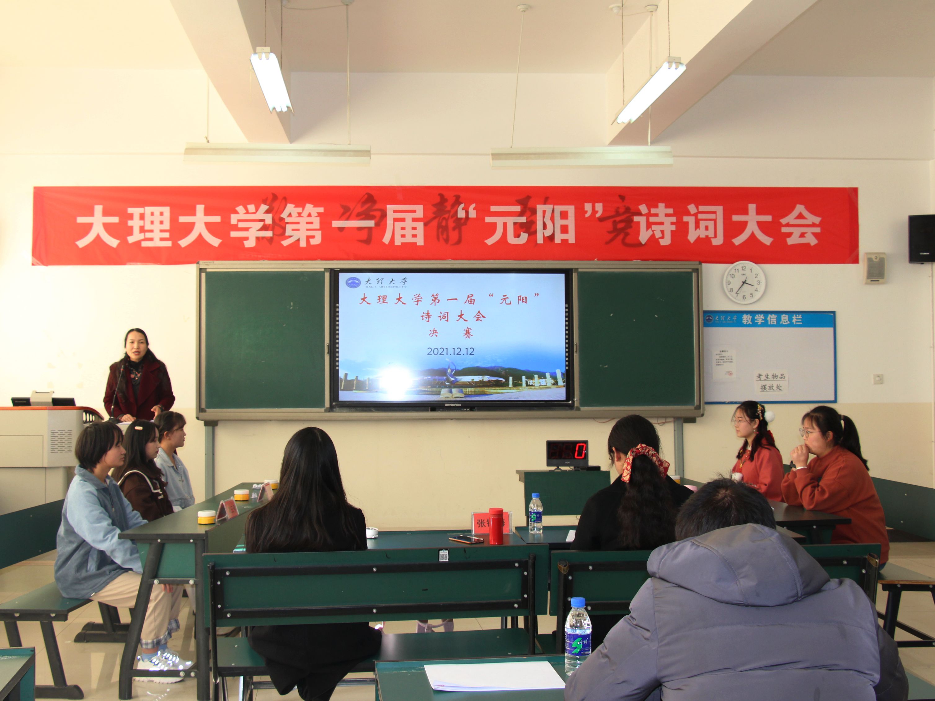 “賞中華詩詞,尋文化基因,品生活之美”。12月12日,由大理大學第十六屆校園文化節組委會主辦,文學院承辦的大理大學第一屆“元陽”詩詞大會決賽順利結束。比賽邀請了文學院副院長張錫梅副教授,文學院文學教研室段麗博士、董曉霞博士擔任評委,文學院張倩同學擔任主考兼主持。