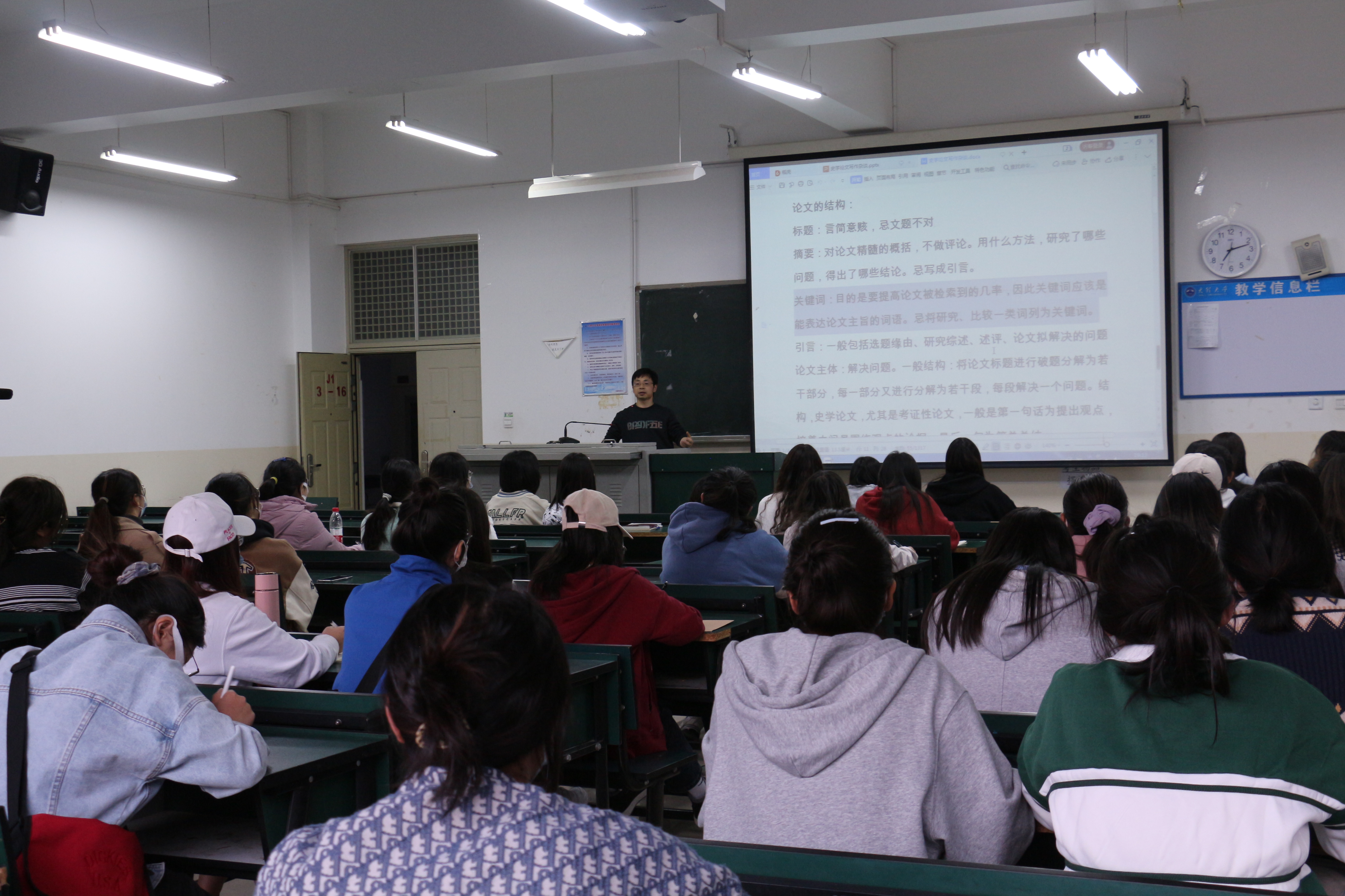 講座中,羅老師從自身的學術寫作經歷出發,就如何選題、如何判斷一個選題是否能做、選題的價值如何判斷、如何搜集資料以及綜述寫作的重要性等展開了系統地講解,以自己的研究過程和成果為例,深入淺出地給文學院師生們講述了論文寫作的基本要領和相關的專業知識。