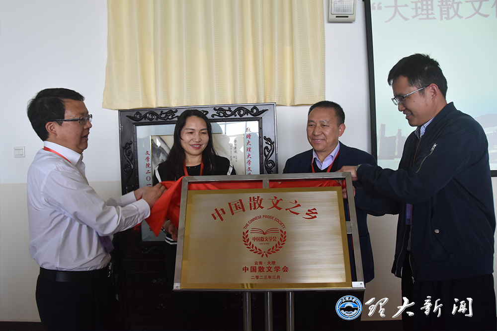 張海亮和湯培德一同為中國散文學會頒發給大理白族自治州的“中國散文之鄉”揭牌。