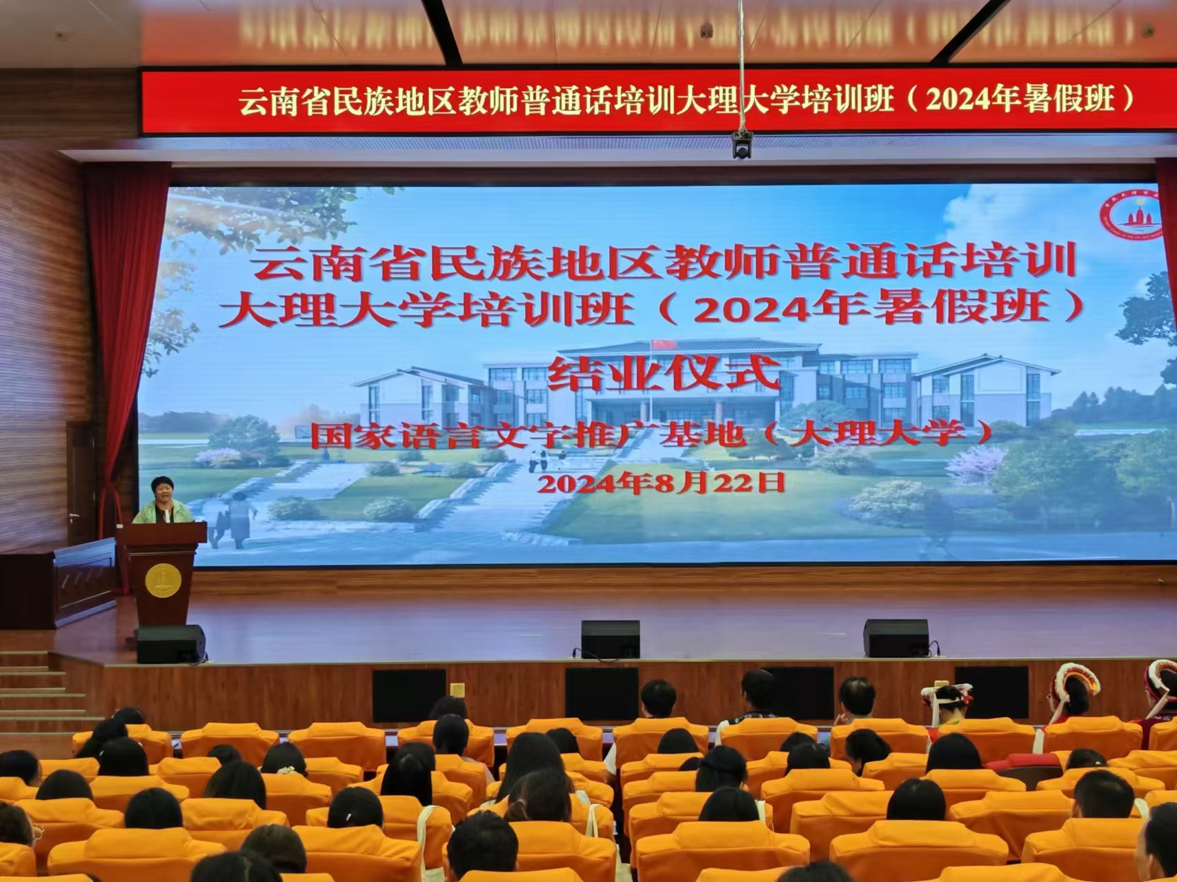 8月22日,由云南省教育廳主辦、國家語言文字推廣基地(大理大學(xué))承辦的云南省民族地區(qū)教師普通話培訓(xùn)大理大學(xué)培訓(xùn)班(2024年暑假班)按計(jì)劃完成各項(xiàng)學(xué)習(xí)任務(wù),并舉行了結(jié)業(yè)儀式。國家語言文字推廣基地(大理大學(xué))首席專家周錦國老師,國家語言文字推廣基地(大理大學(xué))辦公室副主任張錫梅老師、楊社娥老師參加了結(jié)業(yè)儀式。