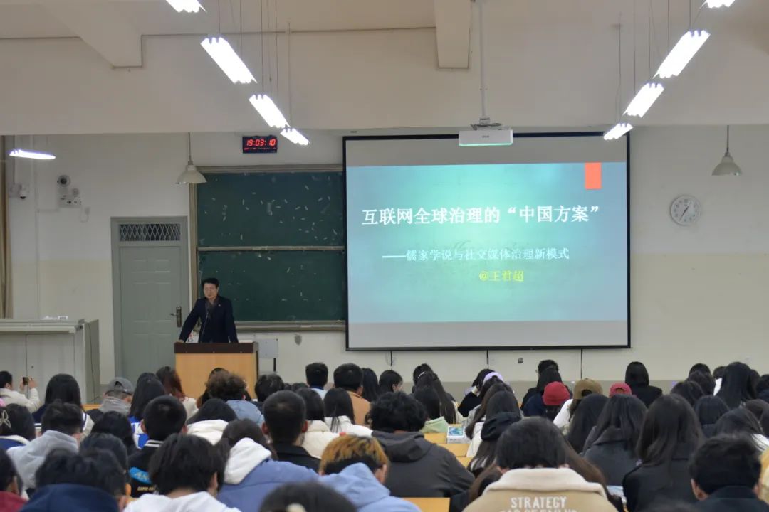 “儒家文化與互聯網全球治理的‘中國方案’”講座有二百余名師生到場聆聽。王君超教授首先從選題意義闡釋出發,結合了儒家經典學說、黨的二十大和習近平在文化傳承座談會上的講話,闡明了要推動中華優秀傳統文化創造性轉化、創新性發展,把優秀傳統文化中具有當代價值、世界意義的文化精髓提煉出來、展示出來的觀點。隨后,王君超教授對于互聯網如何治理,提出自己的“中國方案”——“向內轉”。他將文學的向內轉和新聞傳播的向內轉進行對比,具體說明了“向內轉”“去西方化”的研究視角和挖掘優秀中華傳統文化價值的轉型。隨后,王君超教授從“亞洲價值觀”、外國人看待中華文化的角度對于“向內轉”作了進一步闡明。