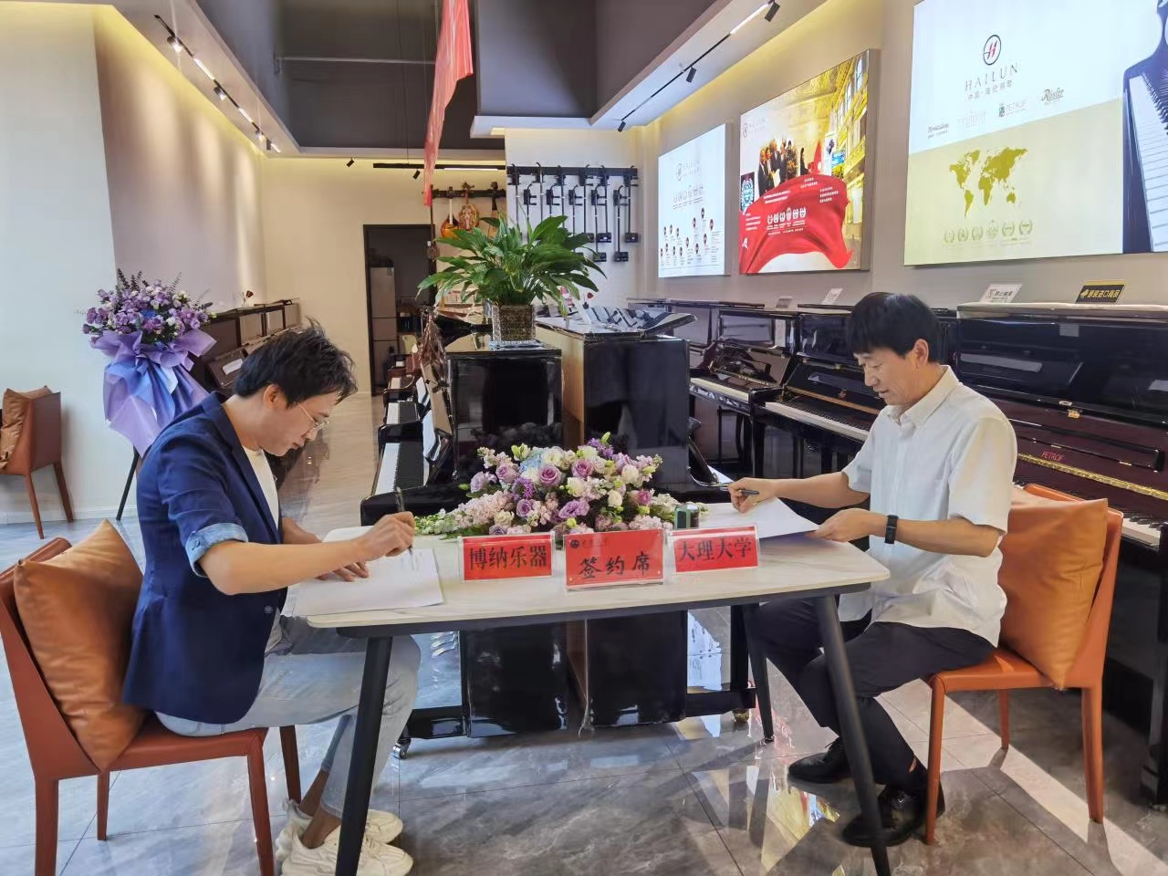 在大理博納樂器有限公司,同時還簽訂了“海倫獎學金合作協議書 ”,海倫鋼琴股份有限公司在藝術學院設立“海倫獎學金”(2萬元/年,持續3年)獎勵品學兼優的學生。