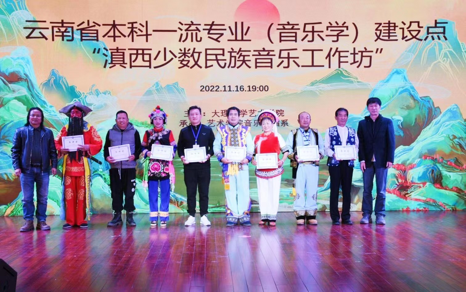 晚會上,聘請了12位優(yōu)秀的民間藝術(shù)傳承人為大理大學(xué)藝術(shù)學(xué)院民族藝術(shù)館民間藝術(shù)指導(dǎo)教師,并頒發(fā)聘書。